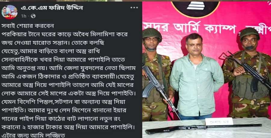 আলোচিত ওই স্ট্যাটাস সবাইকে শেয়ার করার আহ্বান জানিয়ে লেখা হয়েছে, ‘‘... তোকে বলছি, যেহেতু আমার বাড়িতে বাংলা অস্ত্র রাখি সেনাবাহিনীকে খবর দিয়া আমারে পাশাইলি (ফাঁসাইলি)। তাতে আমি অনুতপ্ত নয়। আমি জেলা যুবদলের নেতা ছিলাম আমি একজন ঠিকাদার ও প্রতিষ্ঠিত ব্যাবসায়ী। যেহেতু আমারে অস্ত্র দিয়ে পাশাইলি (ফাঁসাইলি), তাহলে আমি যেই মাপের লোক আমারে সেই মাপের একটা অস্ত্র দিয়ে পাশাইতি। যেমন বিদেশি পিস্তল, শটগান বা অন্যান্য অস্ত্র দিয়া পাশাইতি। আমার দুঃখ লেদ মিশেনে (মেশিন) বানানো এয়ারগানের পাইপ দিয়া কাঠের বাট লাগানো নতুন রং করানো ২ হাজার টাকার অস্ত্র দিয়া আমারে পাশাইলি। এটার জন্য আমি লজ্জিত। এই বুড়া অস্ত্র দিয়া আমার মানসম্মান শেষ করলি।’’