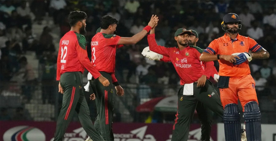 ওভারের দ্বিতীয় বলে ম্যাক্স ও’ডাউড (৮) এবং পরের বলে তেজা নিদামানুরুকে ডাক আউট করেন এই টাইগার স্পিনার। অপর প্রান্ত থেকে রান তোলার চেষ্টা করেন আরেক ওপেনার বিক্রমজিৎ সিং। কিন্তু ইনিংস বড় করতে পারেননি তিনি। ১৭ বলে ২৪ রান করে তাসকিনের প্রথম শিকার হন এই বাঁ-হাতি ব্যাটার।