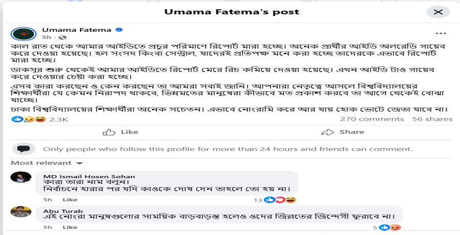 ওই পোস্টে উমামা ফাতেমা আরও লেখেন, ‘ডাকসুর শুরু থেকেই আমার আইডিতে রিপোর্ট মেরে রিচ কমিয়ে দেয়া হয়েছে। এখন আইডিটাও গায়েব করে দেয়ার চেষ্টা করা হচ্ছে।’