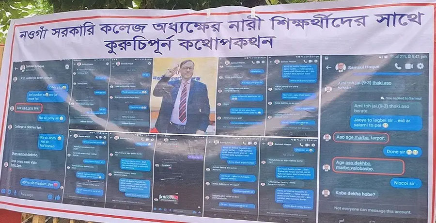 বক্তারা বলেন, নওগাঁ সরকারি কলেজের অধ্যক্ষ প্রফেসর সামসুল হক ফেসবুক মেসেঞ্জারে নারী শিক্ষার্থীদের সঙ্গে আপত্তিকর কথোপকথন করেছেন এবং ওড়না ছাড়া ছবি দেওয়ার জন্য বলেছেন। এসব বিষয় প্রকাশ করলে কৌশলে হুমকিও দেওয়া হয়েছে। সম্প্রতি এসব কথোপকথন সামাজিক যোগাযোগমাধ্যমে ছড়িয়ে পড়ে। কোনো শিক্ষার্থী প্রতিবাদ করলে কলেজ প্রশাসন দিয়ে তাদের মারধর করা হয়। পাশাপাশি কলেজে ভর্তিসহ বিভিন্ন অজুহাতে শিক্ষার্থীদের কাছ থেকে অতিরিক্ত ফি নেওয়া হয়। বক্তারা শিক্ষার পরিবেশ ফিরিয়ে আনা এবং অধ্যক্ষের শাস্তির দাবি জানান।