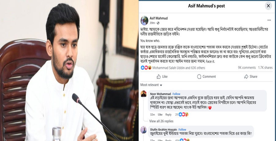 নাম উল্লেখ না করে এবার দেশসেরা ক্রিকেটার সাকিব আল হাসানের নমিনেশন পাওয়া ও আওয়ামী লীগের রাজনীতি করা বিষয়ে ফেসবুকে স্ট্যাটাস দিয়েছেন যুব ও ক্রীড়া উপদেষ্টা আসিফ মাহমুদ সজীব ভুঁইয়া। দুদিন ধরে তাদের মধ্যে চলছে কথার লড়াই।