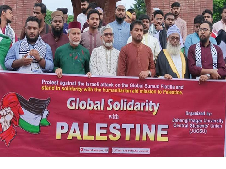 মানবিক সহায়তা নিয়ে গাজামুখি ‘গ্লোবাল সুমুদ ফ্লোটিলায়’ ইসরাইলি বাহিনীর বাধার নিন্দা জানিয়ে এবং এই সহায়তা মিশনের প্রতি সংহতি প্রকাশ করে আজ শুক্রবার (৩ অক্টোবর) জাহাঙ্গীরনগর বিশ্ববিদ্যালয়ের (জাবি) শিক্ষার্থী ও অভিভাবকরা এক প্রতিবাদ মিছিল করেছে।