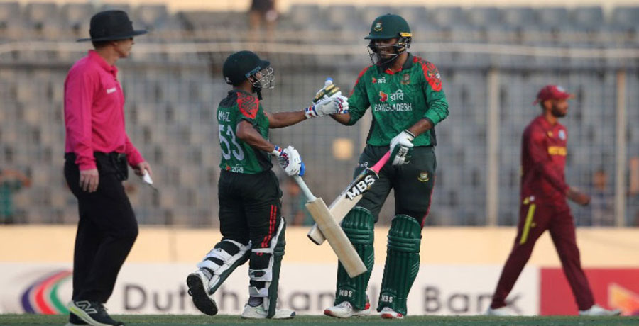 মিরপুরের স্পিন পিচে ক্যারিবীয়রা ঘূর্ণির পসরা সাজিয়ে দেয়। এতে সফলও হয় তারা। তাওহিদ হৃদয়কে ১২ রানে ফেরান গুডাকেশ মোটি। ১৫ রান করে আলিক আথানেজের বলে আউট হন নাজমুল হোসেন শান্ত। একই বোলারের বলে মাহিদুল ইসলাম অঙ্কন। সৌম্য সরকার দৃঢ়তা দেখালেও শেষ পর্যন্ত ৮৯ বলে ৩টি চার ও একটি ছক্কায় ৪৫ রান করে আকিলের বলে আউট হন।