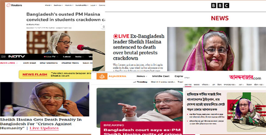 আল জাজিরা শিরোনাম করেছে “মানবতাবিরোধী অপরাধের দায়ে বাংলাদেশে শেখ হাসিনাকে মৃত্যুদণ্ড দেওয়া হয়েছে।” সিএনএন তাদের খবর করেছে “বাংলাদেশের ক্ষমতাচ্যুত নেত্রী শেখ হাসিনার মানবতাবিরোধী অপরাধের দায়ে মৃত্যুদণ্ড।”