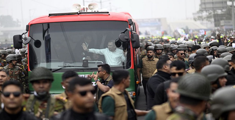 বিমানবন্দর থেকে লালসবুজ রঙে সাজানো বাসে করে রাজধানীর জুলাই ৩৬ এক্সপ্রেসওয়ে এলাকায় গণসংবর্ধনা অনুষ্ঠানস্থলের উদ্দেশে রওনা হন বিএনপির ভারপ্রাপ্ত চেয়ারম্যান তারেক রহমান।