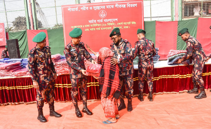 বিজিবি’র উদ্যোগে ঢাকা ব্যাটালিয়ন (২৬ বিজিবি) এর ব্যবস্থাপনায় শহীদ জাকির হোসেন বিজিবি হাসপাতাল, ঢাকা, ফোর্স সাপোর্ট উইং, ঢাকা, ঢাকা ব্যাটালিয়ন (২৬ বিজিবি) এবং আইসিটি ব্যাটালিয়ন এর পক্ষ থেকে রাজধানীর নবাবগঞ্জ পার্কের আশেপাশের এলাকায় বসবাসরত ৮০০ জন শীতার্ত ও অসহায় সদস্যের মাঝে শীতবস্ত্র বিতরণ করা হয়েছে।
