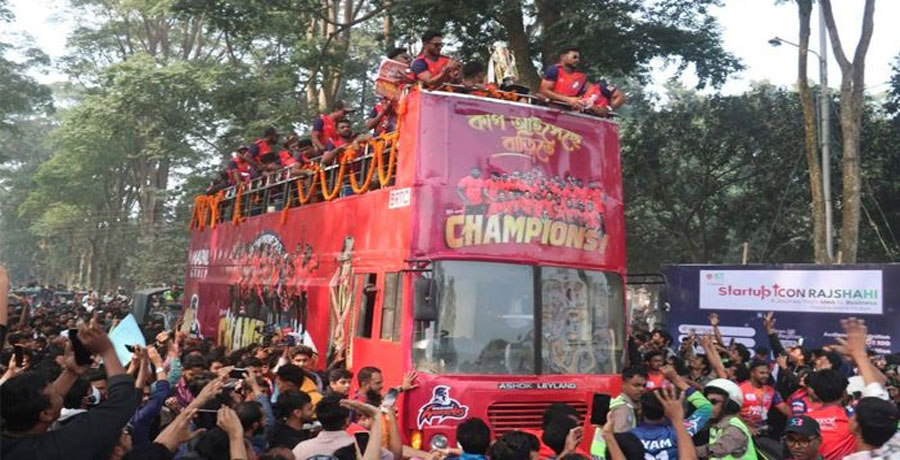 ক্রিকেটারদের নিয়ে ছাদখোলা বাসটি বিমানবন্দর থেকে রাজশাহী-নওগাঁ মহাসড়ক হয়ে আমচত্বর, বিমানচত্বর, রুয়েট ফ্লাইওভার হয়ে রাজশাহী বিশ্ববিদ্যালয়ের প্যারিস রোডে যায়। এ সময় রাবি শিক্ষার্থীরা ফুল ছিটিয়ে তাদের বরণ করে নেন। অনেকে তাদের পরনের শার্ট, টি-শার্ট কিংবা সোয়েটার খুলে চালিয়ে দেন ক্রিকেটারদের দিকে। সেটিতে অটোগ্রাফ দিয়ে ক্রিকেটাররা তা ফেরত দেন। মাঝে মাঝে অধিনায়ক নাজমুল হোসেন শান্ত ও মুশফিকুর রহিম বিপিএল ট্রফি উঁচু করে ধরেন। তখন বাদ্যযন্ত্রের তালে তালে উচ্ছ্বাসে ফেটে পড়েন ক্রিকেটপ্রেমিরা। তাদের সঙ্গে শরীর দুলিয়ে বাসের ওপরেই নাচতে থাকেন শান্ত-মুশফিকরা।